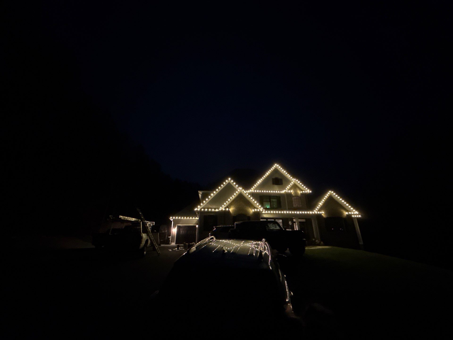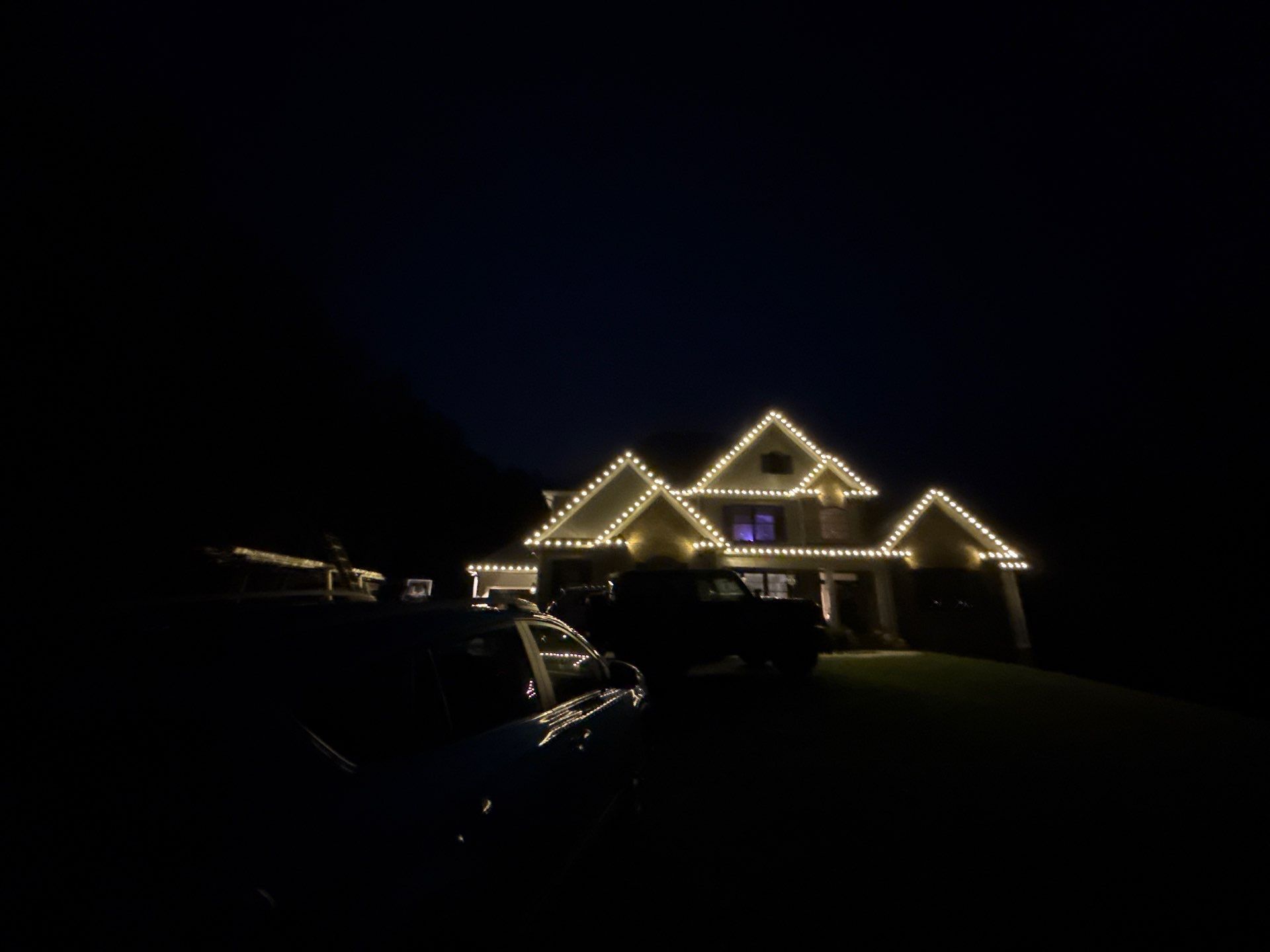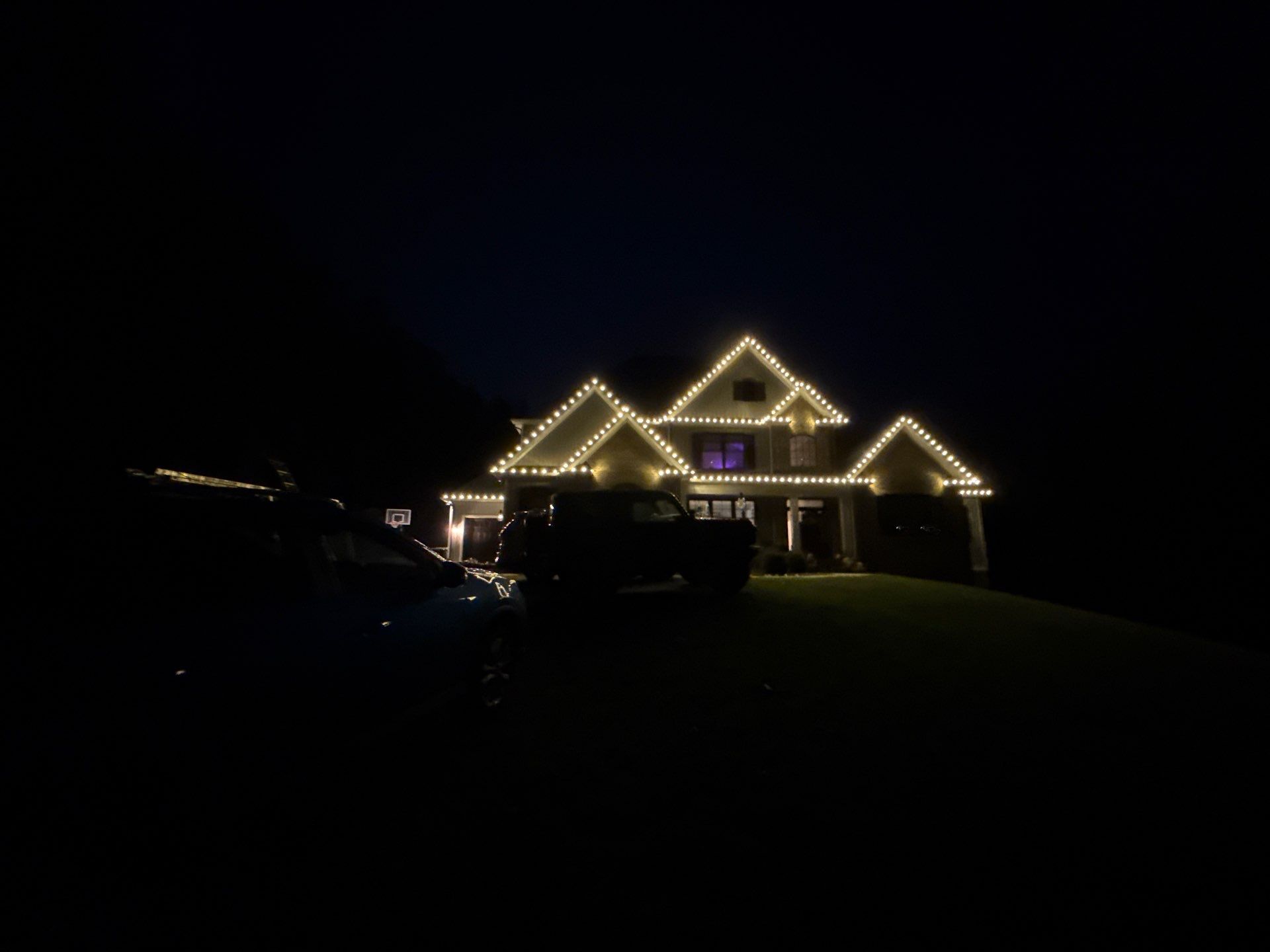 As with every job we complete, safety and precision were top priorities. You’ll see ladders, service vehicles, and equipment in the photos, proof that our team worked methodically during installation to ensure a secure, long-lasting setup. Once the lights were turned on, the home glowed perfectly from every direction.